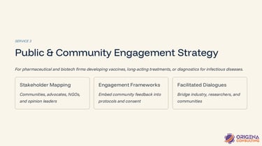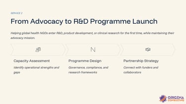 I support organisations working in both emerging and established areas of global health to navigate complex scientific, policy, and access landscapes. Whether advancing new technologies or strengthening long-standing interventions, I provide strategic insight, facilitate stakeholder alignment, and develop practical solutions to enhance research, equity, and real-world impact.